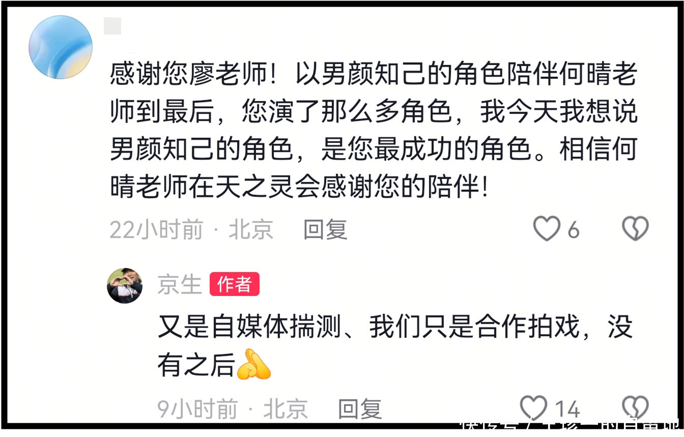 最终,面对这种情况,廖京生再次在自己的账号辟谣和何晴不是夫妻关系,并直言网传的他照顾何晴10年,都是自媒体的揣测。他说他和何晴只有合作拍戏,没有之后。