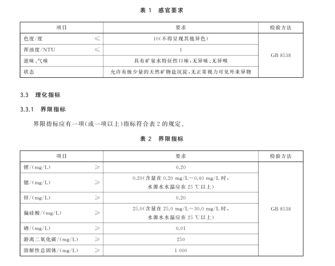 可饮用矿泉水必须符合国标GB 8537要求,其水源必须为地下深层自然涌出或钻井采集的未受污染的地下水,需标注具体水源地,并且要求矿泉水是在水源地附近进行灌装,严令禁止异地运输水源。要求含有特定天然矿物质和微量元素,比如锂、锶、镁、偏硅酸等至少一项达到矿物质界限指标。